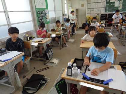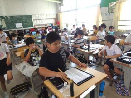 毛筆の学習です。 小筆を使い、名前を書く練習をするそうです。