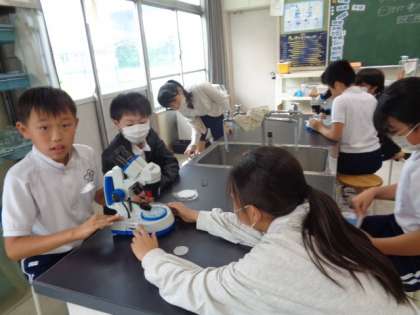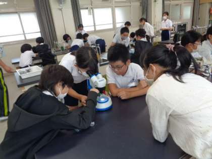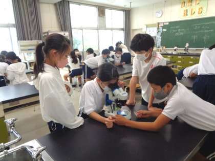 双眼実態顕微鏡で池の水を観察していました。 この後、より倍率の高い生物顕微鏡も使ってみるそうです。