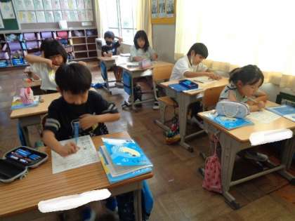「100をこえる数」 学んだことの復習です。 プリントの問題に、真剣に取り組んでいました。