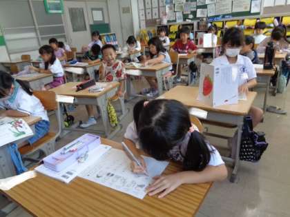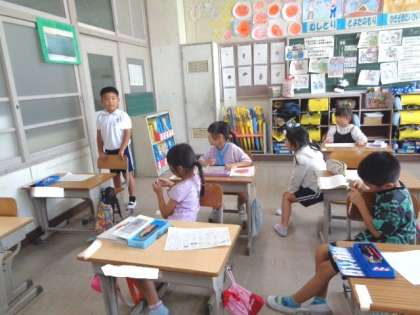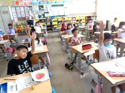 7/18 国語(1年生) 公開日 2023/07/18 更新日 2023/07/18 校長室から 「おおきなかぶ」 教科書を読んで、登場人物や動物をプリントにまとめ、出てきた順を発表し合って、みんなで確認していました。