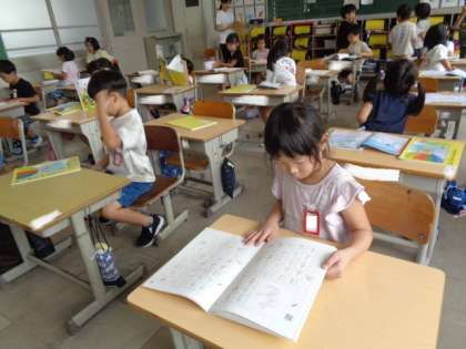 ことばのきまりを使ってひらがなの練習です。 お手本をなぞるなどしながら、ていねいに練習していました。