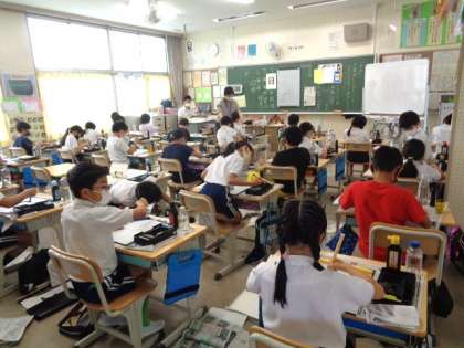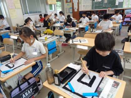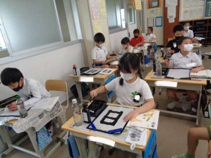 「日」 毛筆の学習です。 筆づかいに気をつけながら、『おれ』のある文字を練習していました。