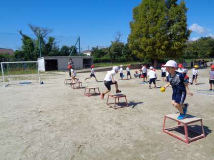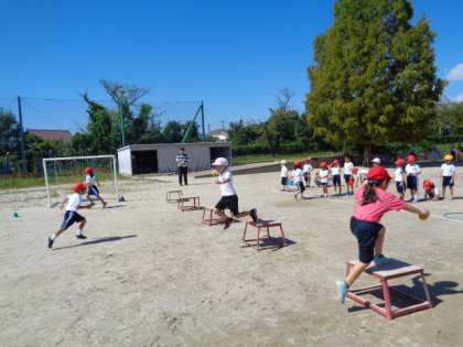 踏み台を使ったレースに取り組んでいました。 まだまだ暑いので、水分をとりながら、無理なく進めています。