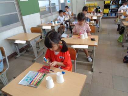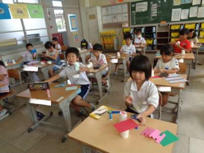9/15 図画工作(1年生) 公開日 2023/09/15 更新日 2023/09/15 校長室から 「かみコップロケットをつくろう」 紙コップを使って作ります。 色をぬったり、いろいろな飾りをつけたりして、楽しく製作していました。
