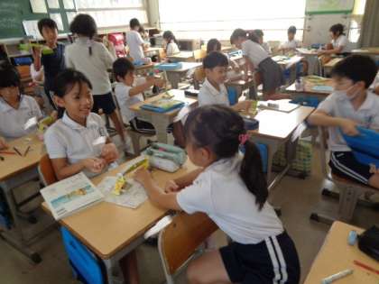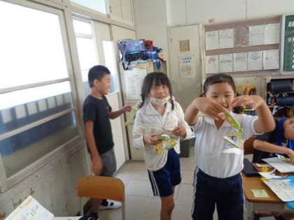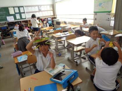 「重さ」 重さの表し方を学習していきます。 巻末にある紙の秤を、作って、いろいろ試してみていました。