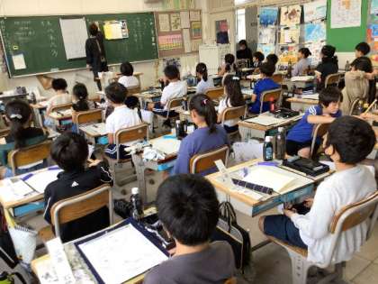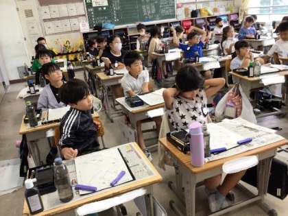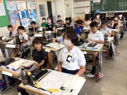 毛筆の学習です。 筆づかいに気をつけながら、『はらい』の練習をしていました。