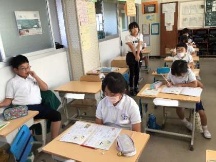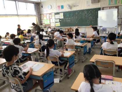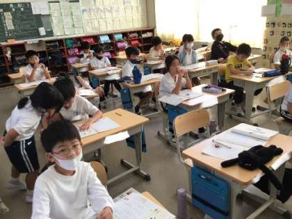 硬筆の学習です。 『左はらい、はね、点』について学習し、実際に練習していました。