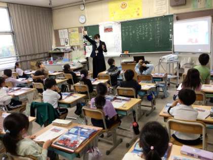 中央図書館の出前事業です。 図鑑を使って、たくさんの秘密を見つけていました。