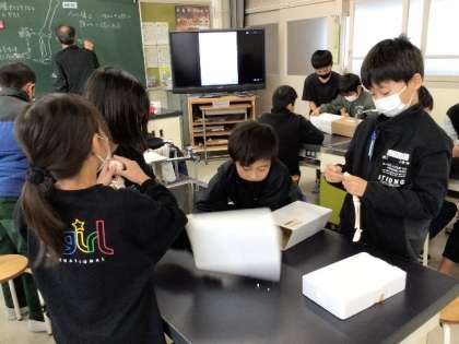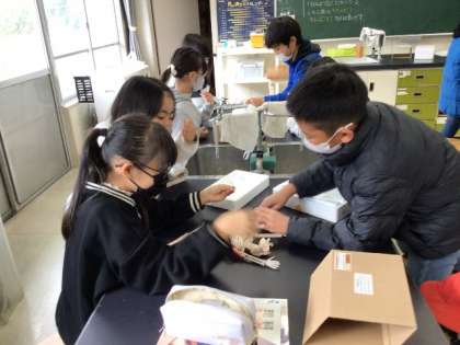 「わたしたちの体と運動」 班ごとに人体模型を見ながら、骨と筋肉のつくりについて学習していました。