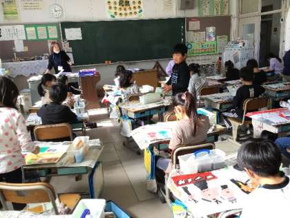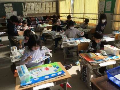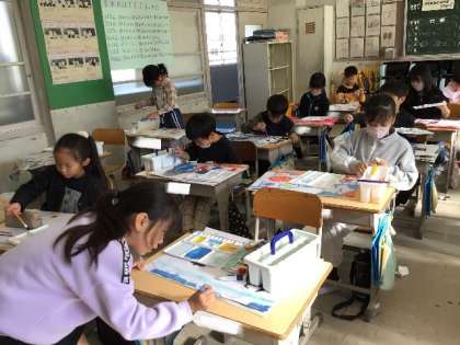 「鬼の小学校」 読書感想画です。 下絵を描いた後、水彩絵の具での彩色に取り組んでいました。