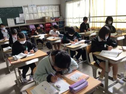 11/22 国語(5年生) 公開日 2023/11/22 更新日 2023/11/22 校長室から 「言葉の練習」 教科書の文章を読んで、線のひかれた言葉が、どの言葉を詳しくしているのか考えていました。