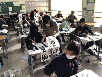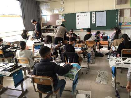 「明るい声」 毛筆の学習です。 今年度も豊田市書写協会の方に、指導をしていただいています。