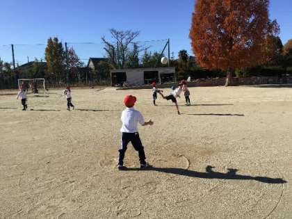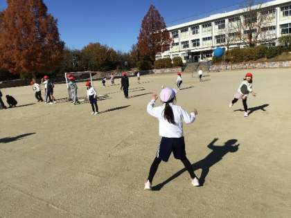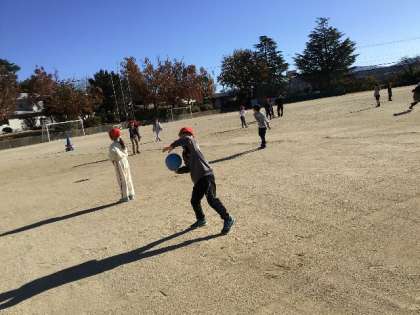 ボールを投げる運動です。 ペアになって、ドッジボールを投げ合っていました。