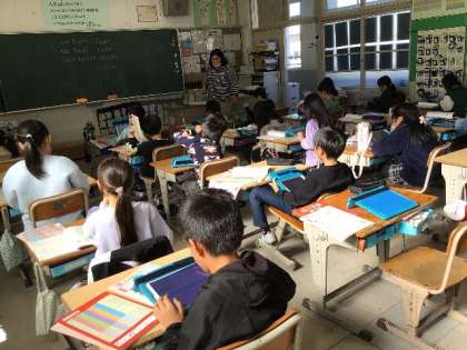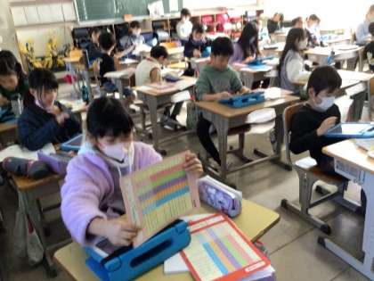「ローマ字」 ローマ字の学習です。 表やタブレットを使って、調べながら進めていました。
