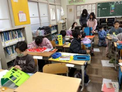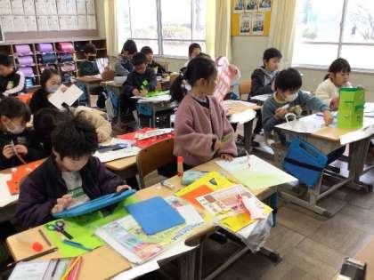1/11 図画工作(2年生) 公開日 2024/01/11 更新日 2024/01/11 校長室から 「まどからこんにちは」 窓の形や開け方、窓を開くと見えるものなど、想像を広げて作ります。 いろいろなアイデアで、楽しんで製作していました。
