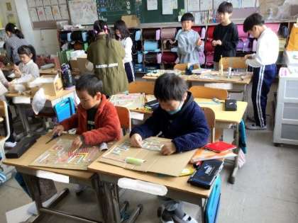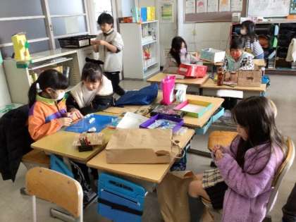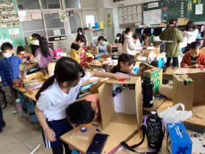 楽しいおもちゃを作っています。 来週、他のクラスと交流し、お披露目するそうです。