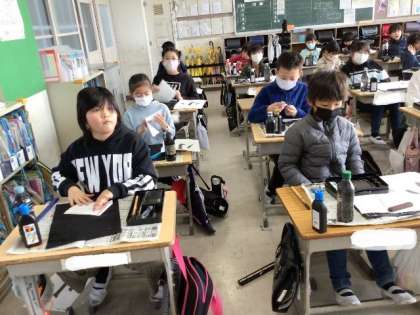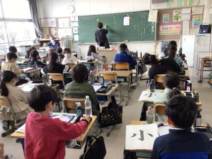 「小」 毛筆の学習です。 はねやてんの筆づかいに注意しながら練習します。