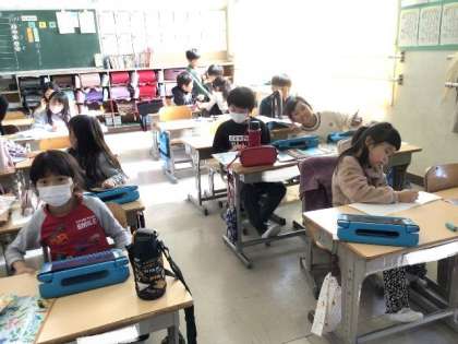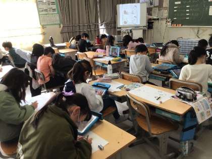 2年生の思い出を絵で表現します。 テーマを決めてから写真等の資料を探し、描き始めていました。