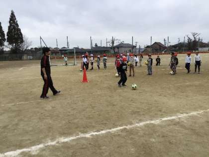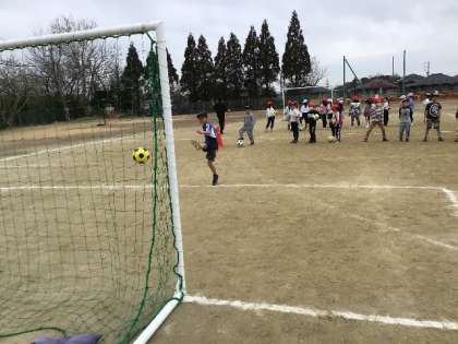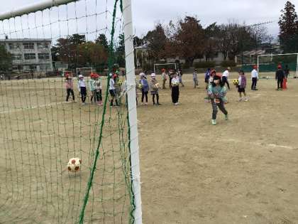 ボールをけるサッカー型のスポーツに取り組んでいます。 ゴールに向かってシュートの練習をしていました。