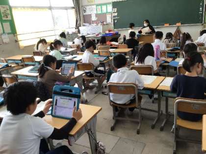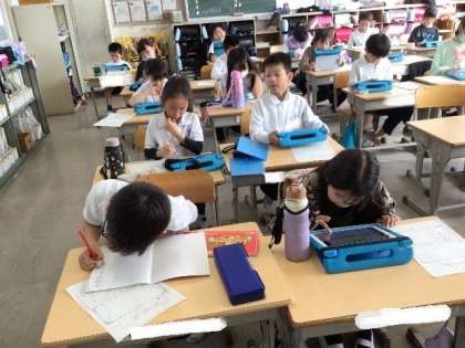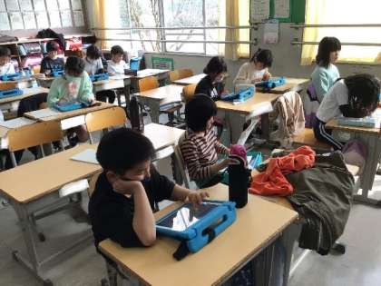 キャリアパスポートの活動です。 1歳から2歳のころの自分を振り返り、タブレットでまとめていました。