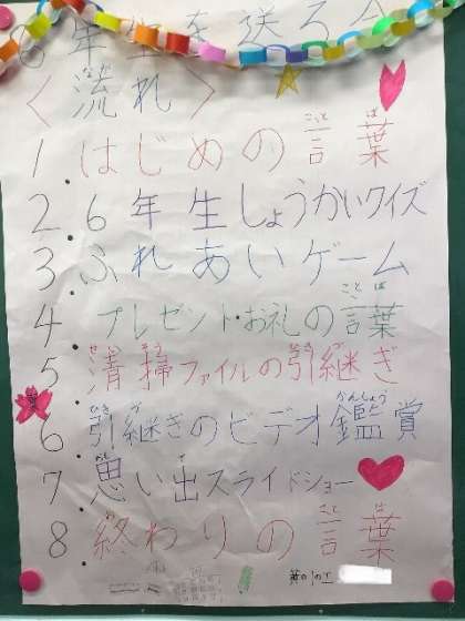 2/28 6年生を送る会9 公開日 2024/02/28 更新日 2024/02/28 校長室から 最後の6年生からの言葉は、1〜5年生へのお礼と励ましの言葉があふれており、みんなの笑顔がいっぱいのとても素敵な時間になりました。