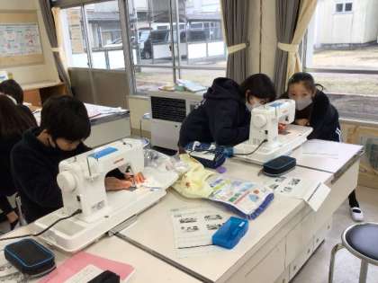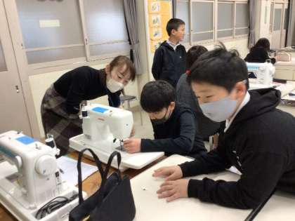 「ミシンにトライ」 ミシンでエプロンを作っています。 あわせて、ミシン準備までのテストをするそうです。