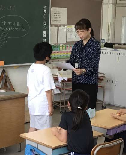 学校全体で取り組んでいる「五つのいっぱい」を中心に、自ら進んで努力を続けたり、学級や学校、地域のために活動したりするなど、活躍している児童に「青木賞」を発行しています。