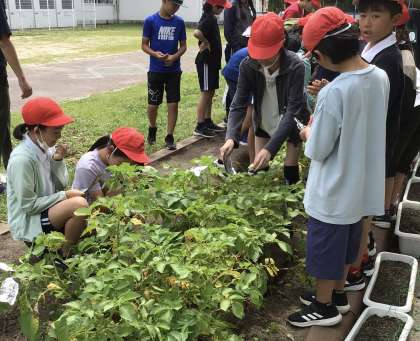 6年生は、理科の「植物の成長と日光のかかわり」の学習で、育てているジャガイモを使って実験をしていました。
