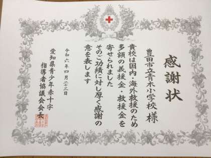 この度、愛知県青少年赤十字指導者協議会から、その功績に対し感謝状をいただきました。