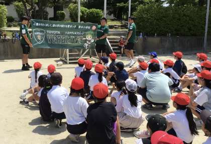 4年生が、トヨタヴェルブリッツの選手をお招きして、タグラグビー教室を行いました。選手の方から、タグのつけ方やラグビーボールの扱い方を教えていただき、実際にタグラグビーのゲームをしました。子どもたちは、元気に走りまわってゲームを楽しみました。