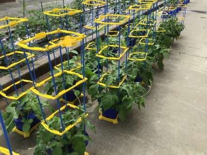 2年生の子から「ぼくのトマトが赤くなったよ」「ナスの実ができてきたよ」と教えてもらい、さっそく植木鉢を見てみました。すっかり大きくなって、実をつけ始めた野菜たち。もうすぐ収穫ができそうです。
