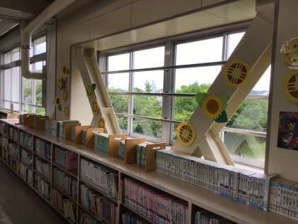 「先生、迷路の本はどこにありますか」「図書室にはヒマワリがいくつあるかな」等、皆で本を探したり、図書室の掲示物を確認したり、楽しみながら本を借りていました。