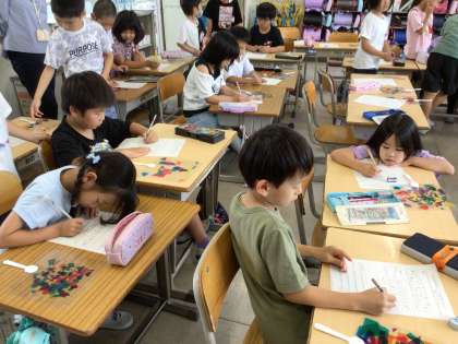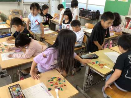 2年生が、図画工作の授業で作った「ひかりのプレゼント」の作品を互いに見合っていました。光に透かして見たり、ここはどうやって作ったの、と聞いてみたり、楽しそうに感想交流をしていました。