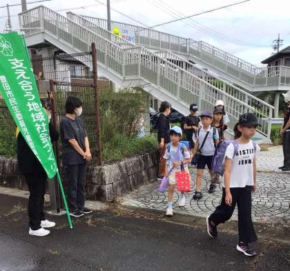9月2日 愛の一声運動 公開日 2024/09/03 更新日 2024/09/03 校長室から 登校初日、地域の方に「愛の一声運動」として、登校の見守りを行っていただきました。 「おはよう」「暑い中、元気に歩いてきたね」等、温かく声をかけていただき、子どもたちも嬉しそうにあいさつをしていました。