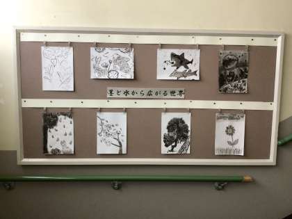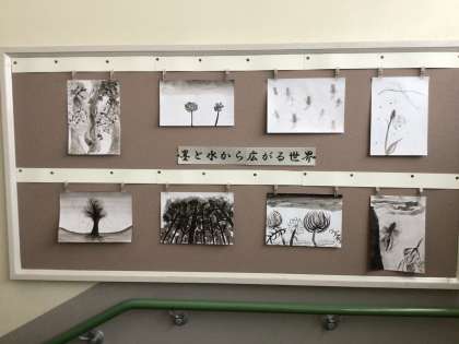 6年生の作品「墨と水から広がる世界」です。 墨の濃淡が美しいです。