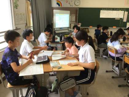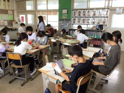 9月10日 学習の様子「詩を読もう」 公開日 2024/09/10 更新日 2024/09/10 校長室から 6年生が、国語科の「詩を読もう」の学習で、「いま始まる新しいいま」を読んでいます。「この言葉はどのような意味だろう」「作者の伝えたいことってどのようなことだろう」と、ペアやグループで熱心に話し合いながら、丁寧に読み進めていました。
