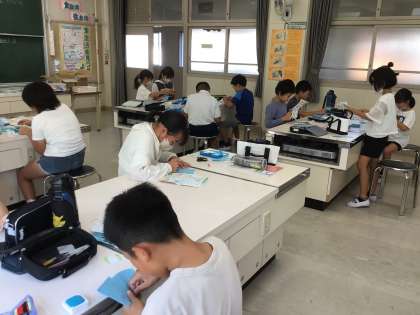 5年生は、家庭科の「小物づくり」で、ティッシュケースなどの小物を手縫いで制作していました。