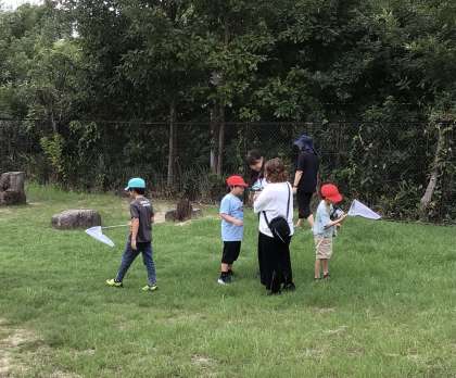 7組の子どもたちが、校庭で虫取りをしていました。虫かごを見せてもらったら、大きなショウリョウバッタやトノサマバッタが入っていました。「足で草をこうすると虫がとぶよ」と、虫の見つけ方を教えてくれました。