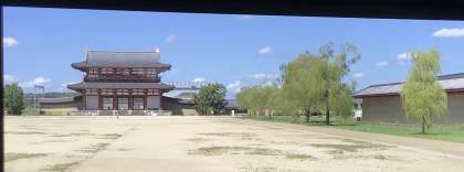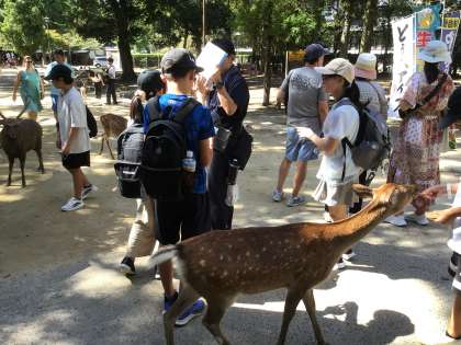 昼食後、バスの車窓から朱雀門や三重の塔などを眺めながら、奈良公園に向かいました。