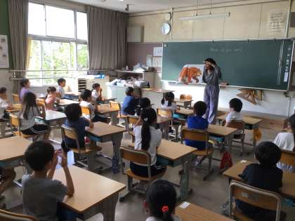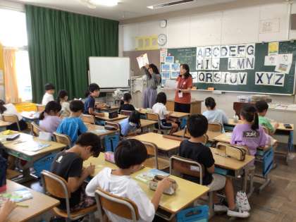 1年生は、英語の絵本を読んでもらい、出てきた動物の名前を英語で復唱していました。