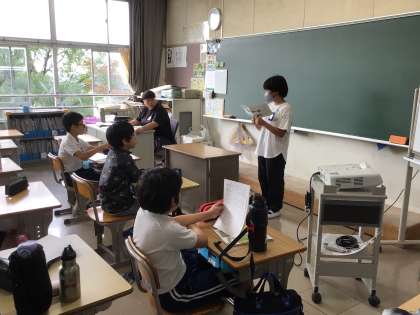 生活委員会と給食委員会の子どもたちが、委員会の時間に月のめあてを考え、担当の学級に意図を説明しています。