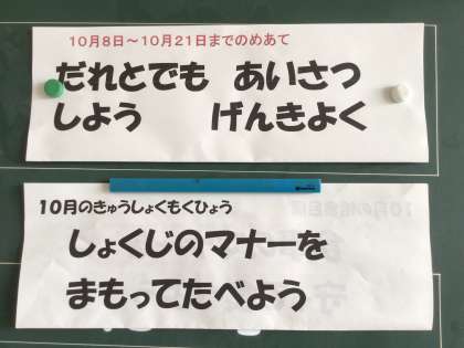 今月の生活のめあては「誰とでも あいさつしよう 元気よく」、給食のめあては「食事のマナーを守って食べよう」です。