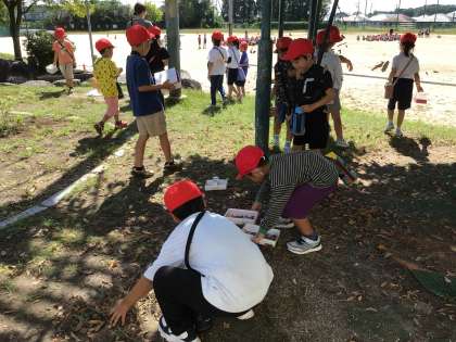 10月11日 学習の様子 公開日 2024/10/11 更新日 2024/10/11 校長室から 1年生の子どもたちが、生活科で「あきのあそび」の学習に取り組んでいます。校庭を散策しながら、落ち葉やドングリなど、自分が見つけた秋の宝物を嬉しそうにしまっていました。