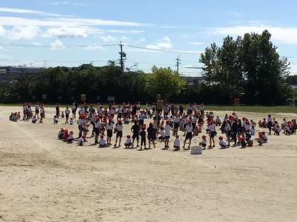「今年の運動会のテーマはFLY HIGHに決まりました。FLY HIGHの意味は、大空へはばたけ、という意味です。皆さんは、大きな力をもっているので、その力を大空にはばたかせ、見てくれている人に感動と勇気を送りましょう!そして、このFLY HIGHをテーマに、みんなで最高の運動会にしましょう」
