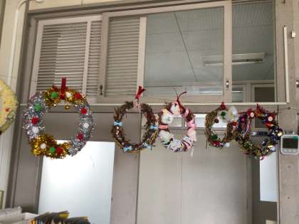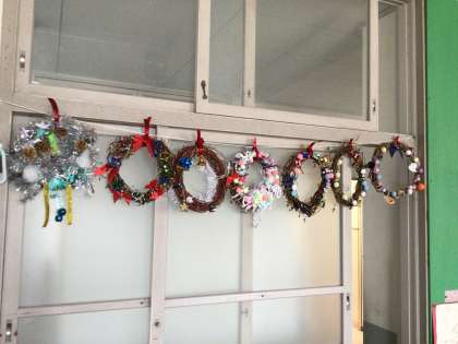 1年生が、アサガオのツルで制作したリースを飾り付けました。