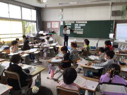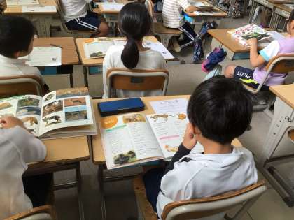 2年生は、豊田市中央図書館から講師の先生に来ていただき、図鑑の使い方や調べ方をとても楽しく教えていただきました。目次や索引などの使い方を知り、動物の名前や体長を調べたり、質問の作り方を学んだりしました。授業が終わった後、動物の本を借りに図書館へ行く子が大勢いました。