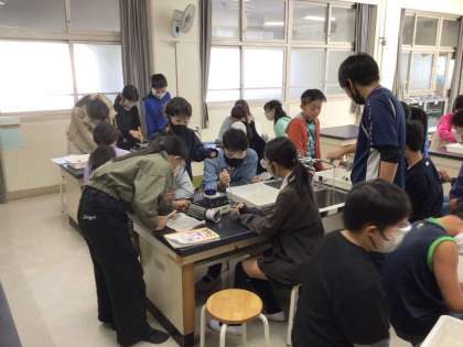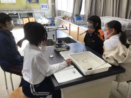 6年生が理科の学習で「水溶液の性質」に取り組んでいます。いくつかの水溶液のにおいを確かめたり、熱したりして塩酸の特定をしていました。