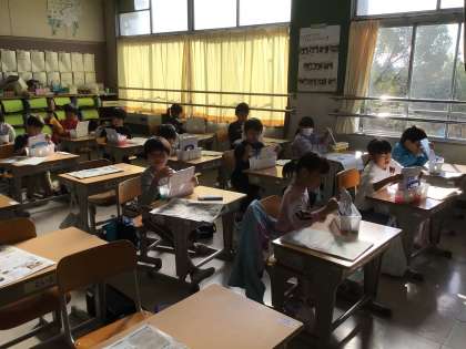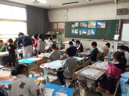 1年生は、絵の具を使い始めました。葉っぱの図柄を色の濃さを変えて丁寧に塗っていました。