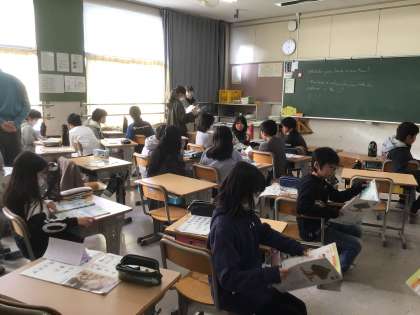 5年生も、英語での道案内の仕方をペアで練習したり、算数の問題の解き方の説明をグループで話し合ったりしながら学習に取り組んでいます。