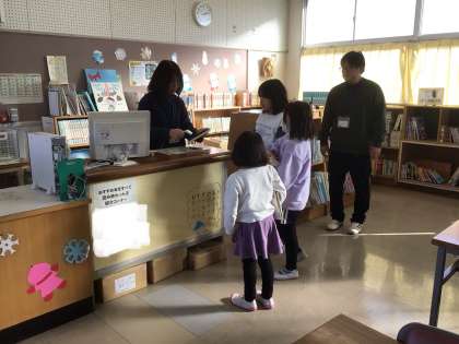 6組の子どもたちが本を借りに図書館に来ました。学校図書館司書さんに「雪だるま読書週間だから2冊借りることができるよ」と声をかけてもらい、熱心に本を選んでいました。